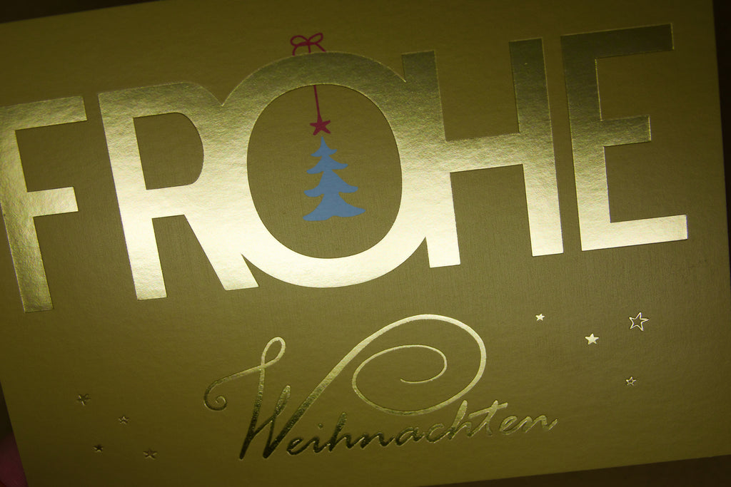 Goldene Weihnachtszeit. Wunderschöne Hochglanz-Kunstdruck-Weihnachts-Grußkarte mit hochwertiger herausragender Gold-Folienprägung (Effekt auf dem zweiten Bild ersichtlich) im Format 10,5 x 14,8 cm