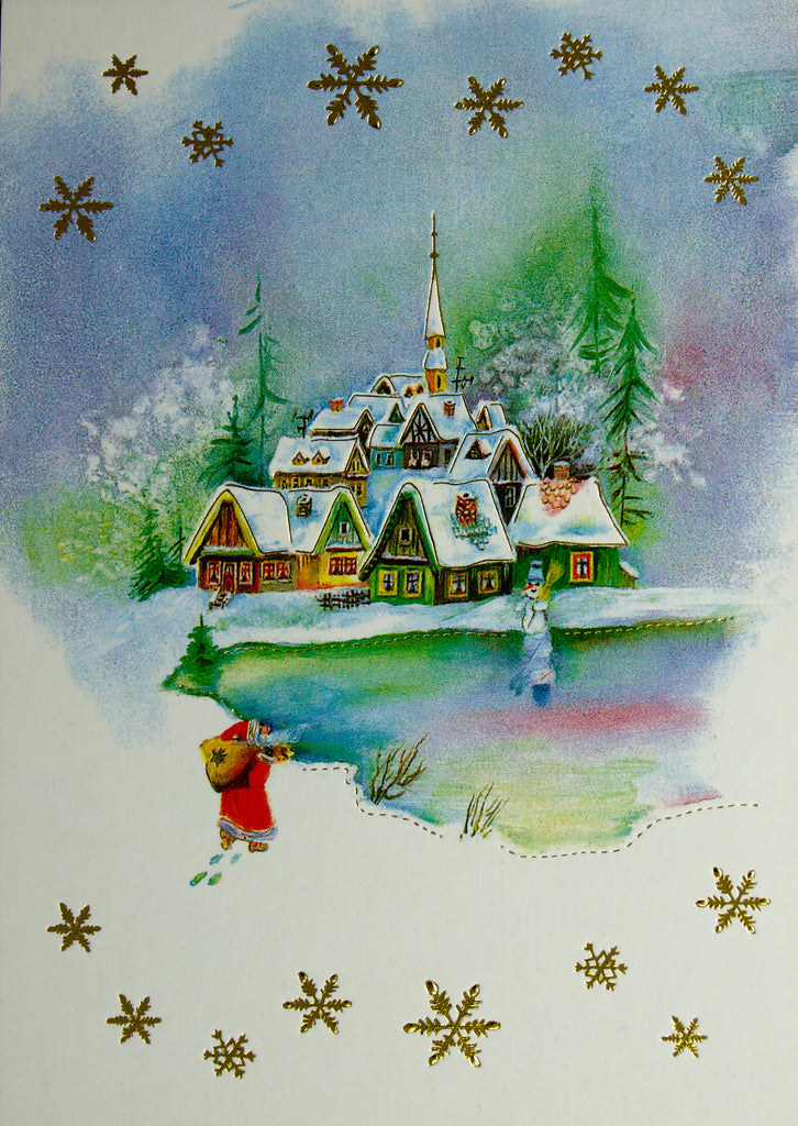 Weihnachtskarte Weihnachtsmann führt Engel auf der Maschine aus